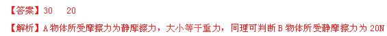 如上右图所示,物体A重30N,用F等于50N的力垂直压在墙上静止不动,则物体A所受的摩擦力是 N;物体B重30N,受到F等于20N的水平推力静止不动,物体B所受的摩擦力是 N。