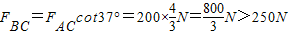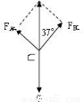 .如图所示,用绳AC和BC吊起一个物体,它们与水平方向的夹角分别为37°和53°,若物体的重力为100N,则两条绳所承受的拉力分别为多大?若AC绳能承受的最大拉力为200N,BC绳能承受的最大拉力为250N在增加重物的重力过程中,哪条绳先断?(sin37°=0.6,cos37°=0.8)