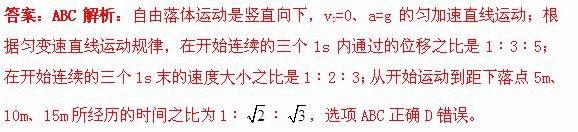 D.从开始运动到距下落点5m、10m、15m所经历的时间之比为1∶2∶3。
