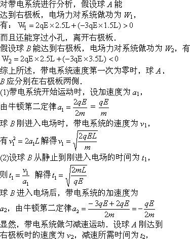 如图所示,沿水平方向放置一条平直光滑槽,它垂直穿过开有小孔的两平行薄板,板相距3.5 L.槽内有两个质量均为m的小球A和B,球A带电量为+2q,球B带电量为-3q,两球由长为2L的轻杆相连,组成一带电系统.最初A和B分别静止于左板的两侧,离板的距离均为L.若视小球为质点,不计轻杆的质量,在两板间加上与槽平行向右的匀强电场E后(设槽和轻杆由特殊绝缘材料制成,不影响电场的分布),求:
