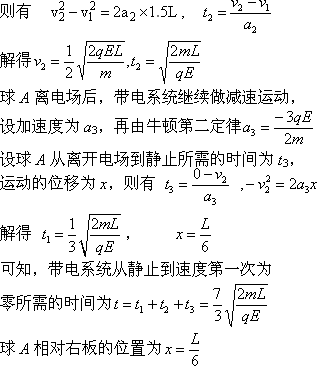 (2)带电系统从开始运动到速度第一次为零所需的时间及球A相对右板的位置?
