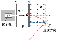 (10分)从粒子源射出的带电粒子的质量为m、电荷量为q,它以速度v0经过电势差为U的带窄缝的平行板电极S1和S2间的电场,并从O点沿Ox方向进入磁感应强度为B、方向垂直纸面向外的有界匀强磁场,Ox垂直平行板电极S2,当粒子从P点离开磁场时,其速度方向与Ox方向的夹角θ=60°,如图8-2-20所示,整个装置处于真空中.![]()