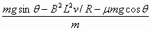 E=BLv ① F=BIL ② a= 由①②③可得a= 在ab下滑过程中v增大,由上式知a减小,循环过程为:v↑→E↑→I↑→F安↑→F合↓→a↓.在这个循环过程中,ab做加速度逐渐减小的加速运动,当a=0时(即循环结束时),速度达到最大值,设为vm.则有 mgsin=μmgcos+ 所以vm= |