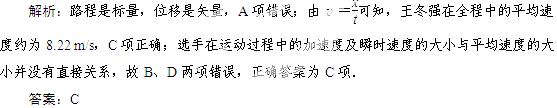 | A、在110 m栏比赛中,选手通过的路程等于位移大小 | B、王冬强在起跑过程中的加速度一定比陆嘉腾的大 | C、13秒41指的是时刻 | D、研究王冬强的跨栏动作时,王冬强不可以看成质点 |
