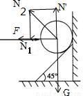 试题分析:如图所示,小球受重力、推力、斜面的支持力及竖直墙的支持力;将斜面的支持力进行分解为竖直方向上的N′=N2cos45°、水平向上的N″=N2sin45°,则由共点力的平衡条件可知:水平方向上:F=N1+N″=N1+N2sin45°;故F一定大于N1;故A错误;竖直方向上:G=N/=N2cos45°,故