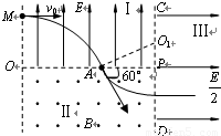,求出在磁场中运动的时间.粒子进入Ⅲ区域的匀强电场中后,先向右做匀减速运动,后向左做匀加速运动,第二次通过CD边界.由牛顿第二定律和运动学公式结合可求得粒子在Ⅲ区域电场中运行时间,即可求解粒子从M点出发到第二次通过CD边界所用时间.