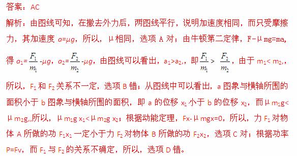 (2013邯郸摸底)质量分别为m1和m2的两个物体A、B,并排静止在水平地面上,如图甲所示,用同方向水平拉力F1、F2分别作用于物体A和B上,作用一段时间后撤去,物体A、B各自滑行一段距离后停止。物体A、B运动的速度—时间图像分别如图乙中图线a、b所示,相关数据已在图中标出,已知m1< m2,下列判断中正确的有( )