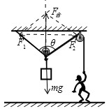 解析试题分析:对结点受力分析,受滑轮的压力和两拉绳子的拉力,根据共点力平衡条件,可以求解出拉力的大小.![]()