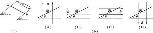 图(a)中质量为m的通电细杆ab置于倾角为θ的导轨上,导轨的宽度为d,杆ab与导轨间的摩擦因数为μ.有电流时,ab恰好在导轨上静止,如图所示.图(b)中的四个侧视图中,标出了四种可能的匀强磁场方向,其中杆ab与导轨之间的摩擦力可能为零的图是( )
