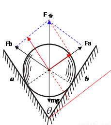 受重力、壁a对小球的支持力、壁b对小球的支持力三个共点力作用,则Fa与Fb的合力与重力是平衡力,且与夹角