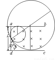 如图所示,一足够长的矩形区域abcd内,有磁感应强度为B、方向垂直纸面向里的匀强磁场。现从矩形区域ab边的中点O处垂直磁场射入一速度方向与ad边夹角为30º、大小为v的带电粒子。已知带电粒子的质量为m,电量为q,ad边长为L,重力影响忽略。试求粒子能从ab边射出磁场的v的范围。