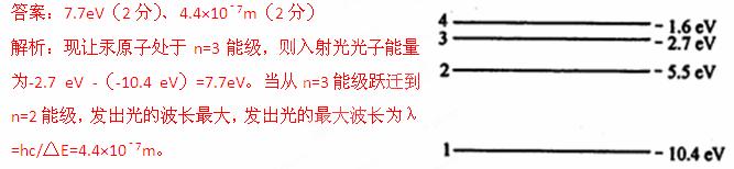 (2013江苏省连云港市期末)汞原子的能级如图所示,现让汞原子处于n=3能级,则入射光光子能量为_______eV,发出光的最大波长为___________m。(普朗克常量为6.63×10-34J·s,计算结果取两位有效数字。)