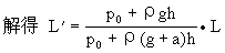空气柱原来的压强为 p1=p0+ρgh 当玻璃管向上作匀加速运动时,空气柱的压强为p2,由水银柱加速度运动得 p2S-p0S-mg=ma ∴ p2=p0+ρ(g+a)h 气体作等温变化 p1LS=p2L′S