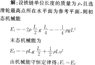 (1)对绳索、链条之类的问题,由于在考查过程中常发生形变,其重心位置对物体来说并不是固定不变的,能否正确确定重心的位置,常是解决该类问题的关键,一般情况下常分段考虑各部分的势能,并用各部分势能之和作为系统总的重力势能,至于参考平面,可任意选取,但以系统初末状态重力势能图便于表示为宜. (2)此题也可运用等效方法求解:铁链要脱离滑轮时重力势能的减少等效于将图中的一半铁链移至另一半铁链的下端时重力势能的减少,然后由ΔEp=-ΔEk列方程求解. |