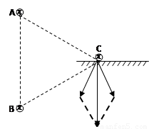 试题分析:根据右手螺旋定则,A电流在C处产生的磁感应强度垂直于AC,B电流在C处产生的磁感应强度垂直于BC,如图所示