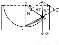 试题分析: 以容器和小球整体为研究对象,分析受力可知:竖直方向有:总重力、地面的支持力,容器相对于水平面无滑动趋势,地面对半球形容器没有摩擦力,故A错误。对小球受力分析:重力G、弹簧的弹力F和容器的支持力N,如图所示