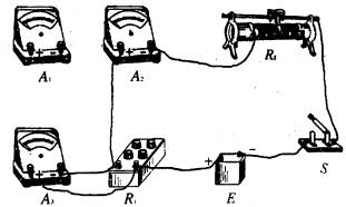 电池E,电动势约10V,内阻约1Ω;电流表A1,量程10A,内阻r1约为0.2Ω;电流表A2,量程300mA,内阻r2约为5Ω;电流表A3,量程250mA,内阻r3约为5Ω;电阻箱R1,最大阻值999.9Ω,阻值最小改变量为0.1Ω;滑线变阻器R2,最大阻值100Ω;开关S;导线若干。