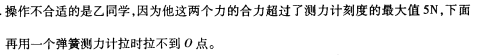 甲、乙和丙三位同学做“互成角度的两个力的合成”的实验,所用弹簧测力计的量程为0~5N,他们都把橡皮条的一端固定在木板上的A点,橡皮条的另一端通过细绳连接弹簧测力计,用两个弹簧测力计把橡皮条的另一端拉到某一确定的O点,如图所示,此时细绳都与平板平行,用F1和F2表示拉力的方向和大小。甲同学F1和F2的方向互相垂直,F1=3.0N、F2=3.8N;乙同学F1和F2方向间的夹角约为30°,F1=F2=4.0N;丙同学F1和F2方向间的夹角约为120°,F1=F2=4.0N。这三位同学中操作不合适的是哪一位?并说明原因。![]()