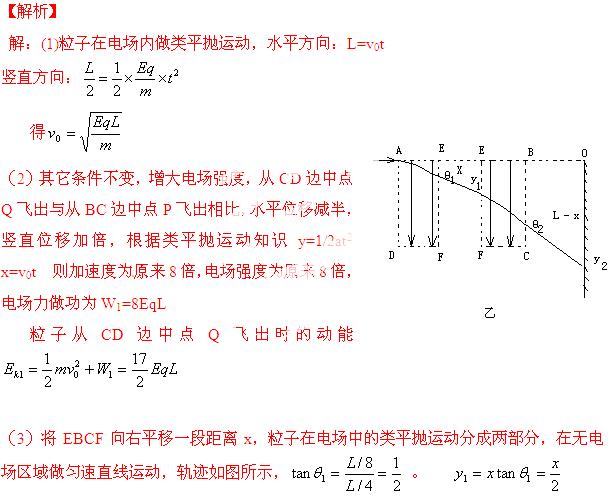 (2)其他条件不变,增大电场强度使粒子恰好能从CD边的中点Q飞出,求粒子从Q点飞出时的动能?