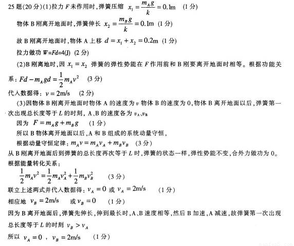 在地面上有竖直放置的静止物体A和B,A、B之间用不计质量的轻弹簧栓接在一起,弹簧的劲度系数k=l00N/m,A、B的质量均为lkg,现用F=20N的竖直向上恒力作用在物体A上,使A竖直上升,重力加速度g=l0m/s2,设弹簧始终是在弹性限度内,空气阻力不计。