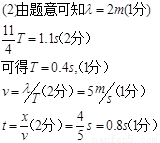 一列简谐横波沿x轴正方向传播,在t=0时刻的波形如图所示,已知在t=1.1s时刻,质点P出现第三次波峰,试求质点Q第一次出现波峰的时间。![]()