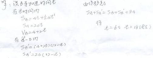 A、B两辆汽车在笔直的公路上同向行驶.当B车在A车前84 m处时,B车速度为4 m/s,且正以2 m/s2的加速度做匀加速运动;经过一段时间后,B车加速度突然变为零.A车一直以20 m/s的速度做匀速运动.经过12 s后两车相遇.问B车加速行驶的时间是多少?
