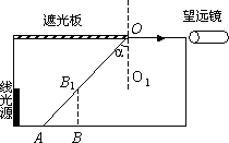 解:解析:当线光源上某一点发出的光线射到未被遮光板遮住的液面上时,射到遮光板边缘O的那条光线的入射角最小. 若线光源底端在A点时,望远镜内刚好可以看到此光源底端,设过O点液面的法线为OO1,则 其中α为此液体到空气的全反射临界角,由折射定律有 同理,若线光源顶端在B1点时,通过望远镜刚好可以看到此光源顶端,则 联立②③式得 由题给条件可知 代入③式得 n=1.25 ⑤