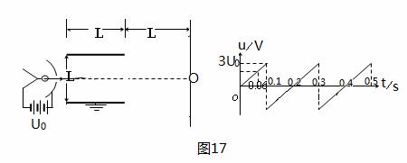 如图17所示,荧光屏的中心点为O,电量为e质量为m的热电子由阴极飞出时的初速忽略不计,电子发射装置的加速电压为U0。电容器的板长和板间距离均为L,下极板接地。电容器右端到荧光屏的距离也是L,在电容器两极板间接一交变电压,上极板的电势随时间变化的图象如图。(每个电子穿过平行板的时间极短,可以认为电压是不变的)求: