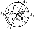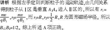 如图所示,在一个圆形区域内,两个方向相反且都垂直于纸面的匀强磁场分布在以直径A2A4为边界的两个半圆形区域Ⅰ、Ⅱ中,A2A4与A1A3的夹角为60°.一质量为m、带电量为+q的粒子以某一速度从Ⅰ区的边缘A1点处沿与A1A3成30°角且平行纸面的方向射入磁场,随后该粒子经过圆心O进入Ⅱ区,最后再从A4处射出磁场.则Ⅰ区和Ⅱ区中磁场磁感应强度的大小之比B1∶B2为(忽略粒子的重力)