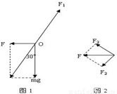 试题分析:设绳AO和绳BO拉力的合力为F,对O点进行受力分析可知, O点受到重力mg、杆的支持力F1和两绳子拉力的合力F,如图1.根据平衡条件得 F=mgtan30°将F分解,如图2,则有AO所受拉力的大小F2=
