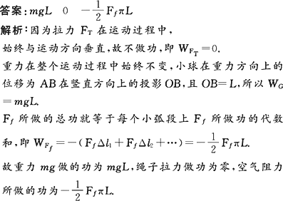 如图所示,摆球质量为m,悬线的长为L,把悬线拉到水平位置后放手.设在摆球运动过程中空气阻力Ff的大小不变,求摆球从A运动到竖直位置B时,重力mg、绳的拉力FT、空气阻力Ff各做了多少功?