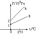 下图给出了同种且质量相等的两部分气体A、B状态变化的等容线,由图中所给的条件可知,当t=273℃时,气体A、B的压强差为________,它们的体积之比________.