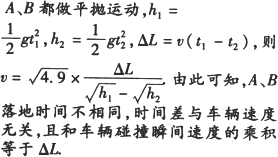 ,式中ΔL是被水平抛出的散落在事故现场路面上的两个物体A、B沿公路方向上的水平距离,h1、h2分别是散落物A、B在同一辆车上时距离落点的高度.只要用米尺测量出事故现场的ΔL、h1、h2三个量,根据上述公式就能够估算出碰撞前瞬间车辆的速度,则下列叙述正确的是