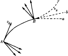 答案:物体在A点时的速度vA沿A点的切线方向,物体在恒力F作用下沿曲线AB运动,此力F必有垂直于vA的分量,即F力只可能为图中所示的各种方向之一;当物体达到B点时,瞬时速度vB沿B点切线方向,这时受 思路与技巧:物体做曲线运动的速度方向即为轨迹上某点的切线方向.一般曲线运动可以将曲线等效成小的圆弧组成,所以曲线运动中必定受到向心的力,即恒力F有指向圆心的分量.因而F应指向曲线弯曲的部分,如图. |