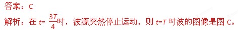 (2013上海市嘉定区期末)在坐标原点的波源从t=0时刻开始向上做简谐振动,振动周期T。在t= 时,波源突然停止运动,则t=T时波的图像是