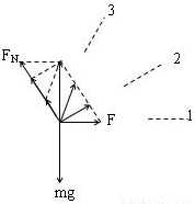 解:以小球为研究对象,小球受到重力、细绳的拉力和斜面的支持力,三力平衡,根据平衡条件得知拉力与支持力的合力与重力mg大小相等,方向相反,保持不变.作出三个位置拉力与支持力的合成的示意图,通过力图可以看出
