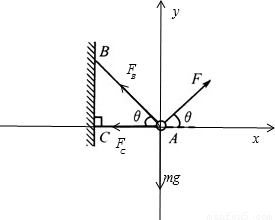 解:对A球受力分析,受到拉力F,重力mg,两根细绳的拉力FB、FC,如图所示,根据平衡条件,有: