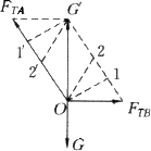 此为一动态平衡问题,结点O受三力作用,其向下拉力为恒力,大小为G,绳OA拉力方向不变,大小变化,而OB绳上拉力的大小和方向均变化.OA绳与OB绳对O点拉力的合力 |