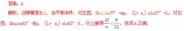 (2013安徽省江南十校联考)如图所示,将两根劲度系数均为k、原长均为L的轻弹簧,一端固定在水平天花板上相距为2L的两点,另一端共同连接一质量为m的物体,平衡时弹簧与竖直方向的夹角为37°。若将物体的质量变为M,平衡时弹簧与竖直方向的夹角为53°(sin37°=0.6),则