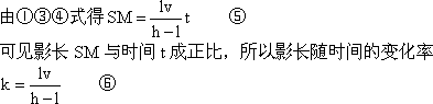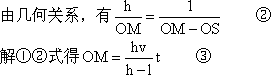 (1)设t=0时刻,人位于路灯的正下方O处, 在时刻 t,人走到S处,根据题意有OS=vt ① 过路灯 P和人头顶的直线与地面的交点M为t时刻人头顶影子的位置, OM为人头顶影子到O点的距离. 因 OM与时间t成正比,故人头顶的影子作匀速运动.(2)由图可知,在时刻t,人影的长度为SM,由几何关系,有SM=OM-OS④ |