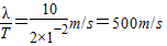 解答:解:(1)由图可知,λ=10m,T=2×10-2s,