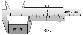 (2)如图乙所示,用游标卡尺测得遮光条的宽度d= ▲ cm;实验时将滑块从图示位置由静止释放,由数字计时器读出遮光条通过光电门的时间Δt=1.2×10-2s,则滑块经过光电门时的瞬时速度为