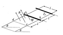 ,导轨间距为l,所在平面的正方形区域abcd内存在有界匀强磁场,磁感应强度大小为B,方向垂直于斜面向上。如图所示,将甲、乙两阻值相同,质量均为m的相同金属杆放置在导轨上,甲金属杆处在磁场的上边界,甲、乙相距l。从静止释放两金属杆的同时,在金属甲杆上施加一个沿着导轨的外力,使甲金属杆在运动过程中始终沿导轨向下做匀加速直线运动,且加速度大小以