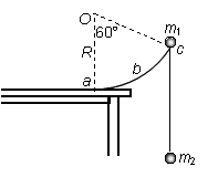 如图所示,圆心在O点、半径为R的圆弧轨道abc竖直固定在水平桌面上,Oc与Oa的夹角为600,轨道最低点a与桌面相切. 一轻绳两端系着质量为m1和m2的小球(均可视为质点),挂在圆弧轨道边缘c的两边,开始时,m1位于c点,然后从静止释放,设轻绳足够长,不计一切摩擦。则