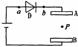 如图所示,D是一只理想二极管,它的作用是只允许电流从a流向b,不允许电流从b流向a.平行板电容器AB内部原有带电微粒P处于静止状态,保持极板A和B的间距不变,使极板A和B正对面积减小后,微粒P的运动情况、极板A和B间电压变化情况分别是