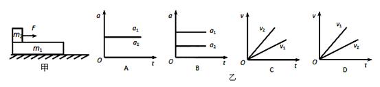 如图甲所示,质量为m1的足够长木板静止在光滑水平面上,其上放一质量为m 2的木块,t =0时刻起,给木块施加一水平恒力F ,分别用、和v1、v2表示木板、木块的加速度和速度大小,图乙中这两个量分别可能符合运动情况的是