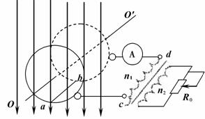 如图所示,导体棒两个端点分别搭接在两个竖直放置、电阻不计、半径相等的金属圆环上,圆环通过电刷分别与两导线c、d相接,c、d两导线的端点分别接在匝数比n1:n2=10:1的变压器原线圈两端,变压器副线圈接一滑动变阻器R0,匀强磁场的磁感应强度为B,方向竖直向下,导体棒长为L(电阻不计),绕与 平行的水平轴(也是两圆环的中心轴)OO'以角速度ω匀速转动.如果变阻器的阻值为R时,通过电流表的电流为I,则