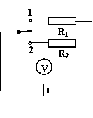 如图所示,是一种测量电源电动势和内阻的电路。已知:R1=0.5Ω,R2=1.5Ω,当电键扳到1位置时,电 压表读数为1V;当电键扳到2位置时,电压表读数为1.5V,求:电源电动势E和内阻r