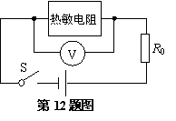 用这种材料制成的热敏电阻与电压表等元件连成如图电路,电源电压恒为6V,电压表量程为0~3V,定值电阻R0的阻值为380Ω。若把电压表的刻度盘改为指示温度的刻度盘,则