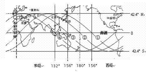 我国“神舟”六号宇宙飞船已经发射成功,当时在飞船控制中心的大屏幕上出现的一幅卫星运行轨迹图,如图所示,它记录了“神舟”六号飞船在地球表面垂直投影的位置变化。图中表示在一段时间内飞船绕地球圆周飞行四圈,依次飞经中国和太平洋地区的四次轨迹①、②、③、④,图中分别标出了各地点的经纬度(如:在轨迹①通过赤道时的经度为西经156°,绕行一圈后轨迹②再次经过赤道时经度为180°……),若已知地球半径为R,地球表面处的重力加速度g,地球自转周期为24h,根据图中的信息: